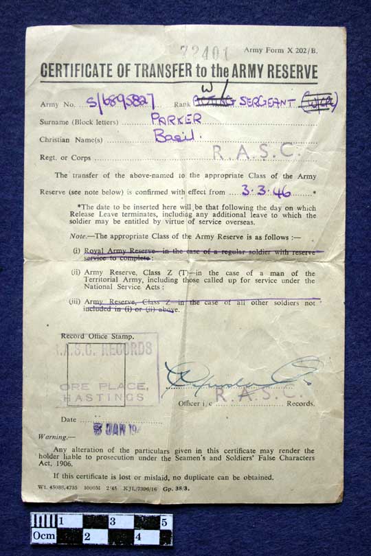 Basil Parker, number 6895827 of the Royal Army Service Corps, dated 3