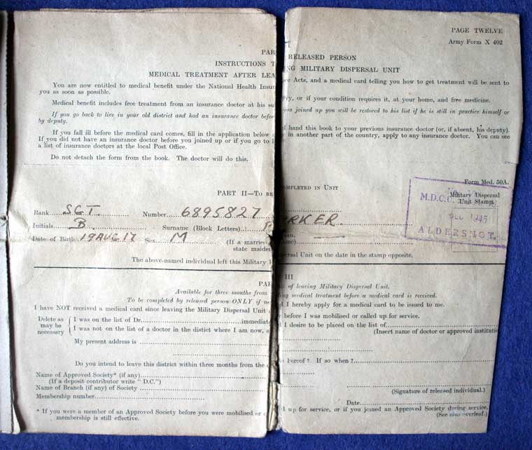 B Parker, number 6895827, Royal Army Service Corps. 25 Oct 1945