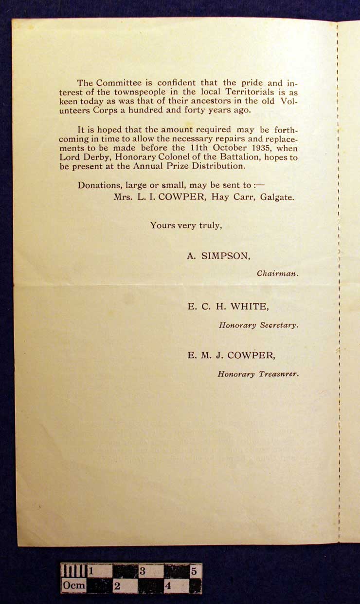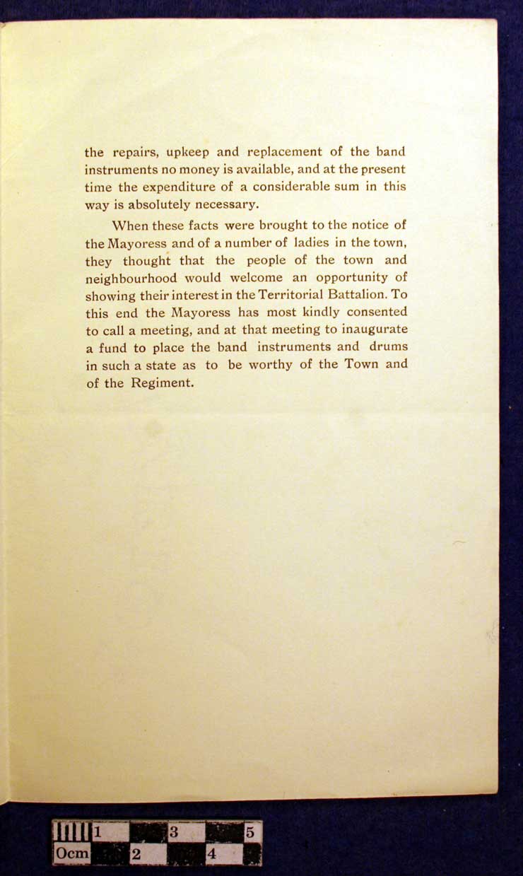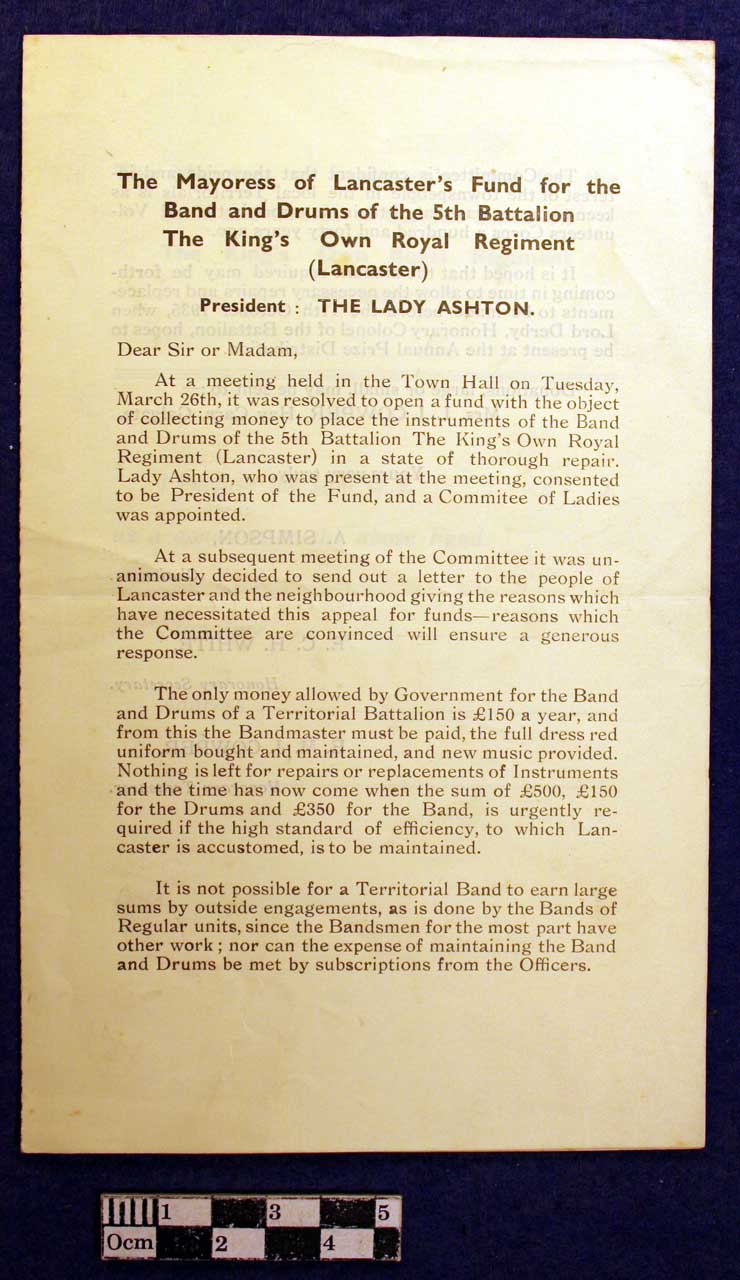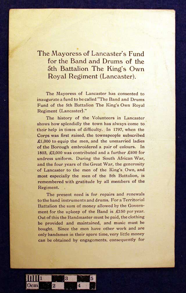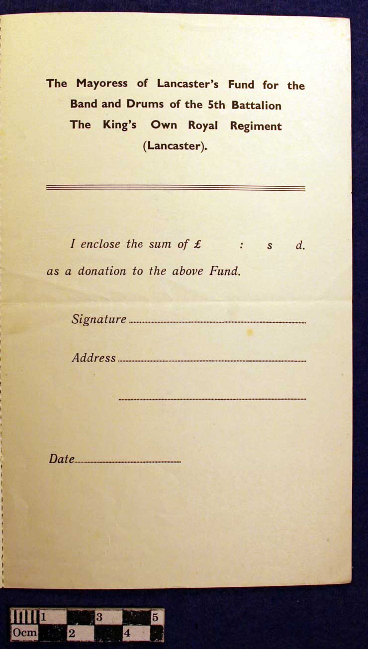 Collections - Archives 5th Battalion, King's Own Royal Regiment 1919-1939 Mayoress of Lancaster's Fund for Band and Drums