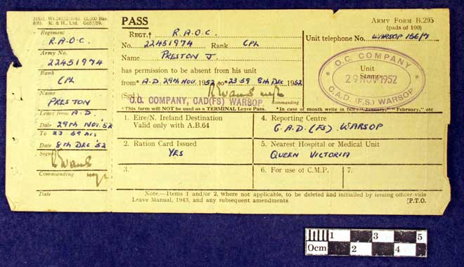 Pass for Corporal J Preston, number 22451974, Royal Army Ordnance Corps,