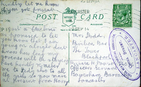 to Mrs Dodd, Pavilion Bar, The Tower, Blackpool, from Private H Pawson,
