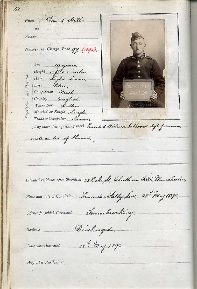 Soldiers of the Regiment Private David Hill in Lancaster Police Book Private David Hill was arrested on 22nd May 1896 for house breaking. His home address was 28 Corke Street, Cheetham Hill, Manchester, although it is likely that he was at Bowerham Barracks in Lancaster at the time of his arrest. He appeared at the Lancaster Petty Sessions on 28th May 1896 and was discharged.