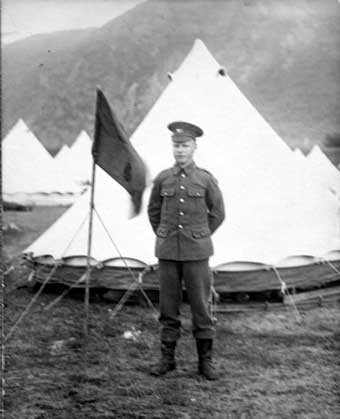 camp, stood in front of a bell tent. Pre-First World War.
