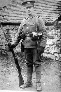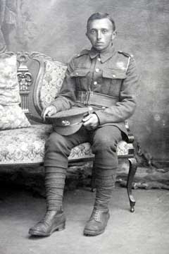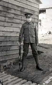 Unknown private soldier photographed in hutted camp. Photograph by A
