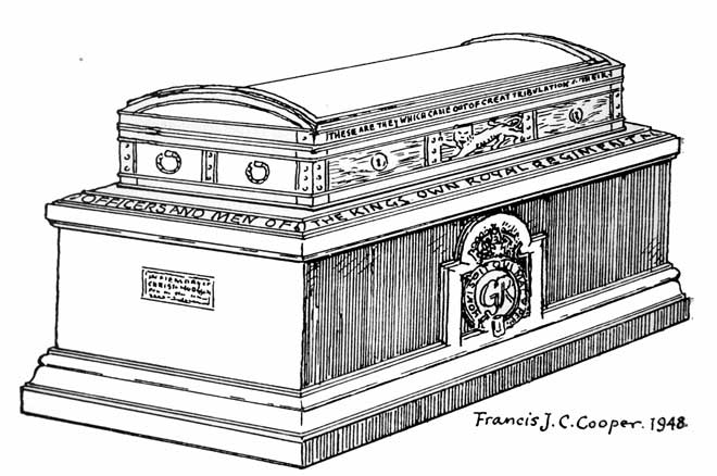 Regimental History The 1939-45 War Memorial of The King's Own The Second World War Memorial in the King's Own Royal Regiment Chapel, Lancaster Priory Church. Near the altar on the right is a bronze casket containing the Rolls of Honour for the First and Second World Wars. This memorial is dedicated to 20 year old 2nd Lieutenant Christopher John Hodgson who was killed in action on 22nd May 1941 at Falluja in Iraq. The Memorial takes the form of a metal bound oak casket, with a curved glass top, through which can be seen the Rolls of Honour for the Great War 1914-1918 and the World War 1939-45. The casket rests on a stone base which is placed before the chancel steps of the Regimental Chapel and in front of the pews on the south side.